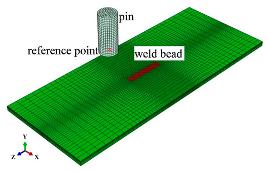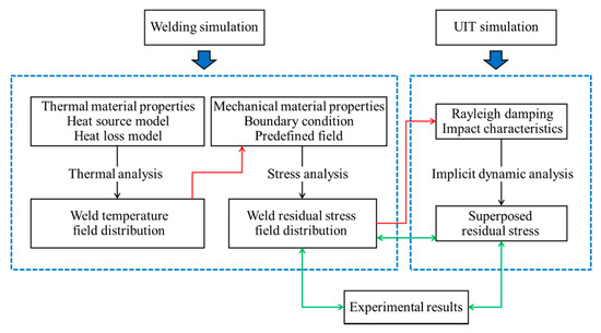 A three-dimensional simulation procedure is carried out including the sequentially coupled thermomechanical welding simulation and the implicit dynamic simulation of the UIT process. An overview of the modelling procedure is shown in Figure 2. The finite element meshing is shown in Figure 3, which consists of 35,148 nodes and 29,904 elements. According to the mesh independent verification, the mesh with 1 mm × 0.5 mm × 1.5 mm near the weld is selected.