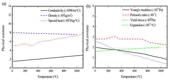 During the stress analysis, the elastic parameters, the plastic parameters and the expansion coefficient need to be set. They are considered to be temperature-dependent as shown in Figure 4b. In this study, the solid-state phase transformation has not been considered in the welding process. Therefore, the welding residual stress is calculated by thermal elasto-plastic analysis. The total strain could be decomposed into elastic strain , plastic strain , and thermal strain [32]: