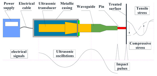 Figure 5 shows the UIT process based on the conversion of electrical signals into impact pulses. A sinusoidal electrical signal generated by an ultrasonic generator is transmitted from electric cable to an ultrasonic transducer. The conversion of electric energy to mechanical energy shown as ultrasonic oscillations is performed by an ultrasonic transducer. The mechanical vibrations are amplified by a waveguide. A pin moves freely between the waveguide and the treated surface as well as impacts on the treated surface, which implements the transformation from impact pulses to force pulses. Statnikov et al. [17] divided the ultrasonic impact into three stages: the frequency increase and plastic deformation saturation stage contributed only 3.6% of the total plastic deformation; the reboundless impact and stress wave propagation stage initiated as much as 78% of that deformation, and the frequency reduction and continuous plastic deformation stage. They also found that the energy utilization rate of UIT is at least 75% and is far higher than 25% of ultrasonic peening treatment. Yuan [31] pointed out the distinctive aspect of UIT and simplified the UIT model proposed by Statnikov [17] in the numerical simulation. Based on the work by Yuan [31] and Statnikov [17], it proposed the corresponding relationship between the simplified oscillogram and plastic deformation generation, as shown in Figure 6.