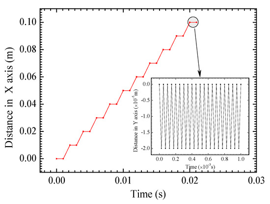 If the UIT process consisting of a large number of impacts is fully analyzed in the simulation, a large amount of time and computation will be required. Hence, it is necessary to simplify the impact process and avoid the meaningless dynamic response. In this study, the movement of the pin controlled by the boundary condition can be decomposed into the vibration perpendicular to the specimen surface and the translation perpendicular to the weld line as illustrated with Figure 7. The pin is set to continuously impact the plate at the same location for 20 times, which would generate sufficient plastic deformation, and reduce welding residual stress effectively. After each ultrasonic impact, the pin is moved with a distance of one radius, which guarantees the enough impact coverage to make the residual stress as homogeneous as possible, and coordinates the proper iteration time. In order to move the pin along the desired trajectory, not only the boundary condition of moving direction but also the freedom of non-moving direction needs to be set in each step. Persistent residual oscillations after UIT could lead to the numerical instability of residual stress field. The introduction of Rayleigh damping consisting of mass proportional damping and stiffness proportional damping is used to achieve energy dissipation, and the principle formula are shown as Equations (13) and (14) [31,32]: