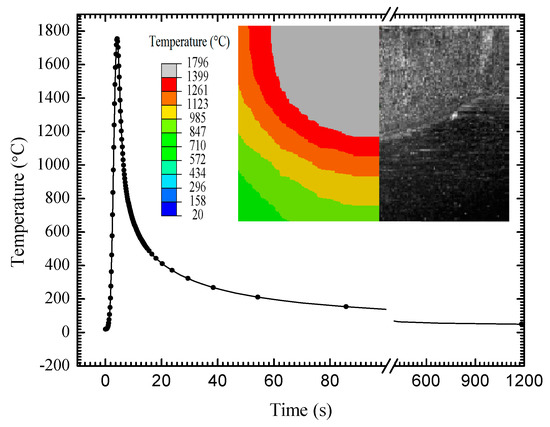 Figure 8 plots the temperature variation curve in the welding process. It shows the characteristics of fast heating and slow cooling, which conforms to the definition principle of the double ellipsoidal heat source distribution model. Figure 7 also compares the temperature contour of weld section by FEM and the weld pool morphology by experiment. It shows that all of the temperatures in the weld region are higher than the material melting point. The simulation result coincides with the experimental result. In the weld zone, the maximum temperature is 1746 °C at the weld center. In the welding heat affected zone (HAZ), the maximum temperature is 1315 °C, which is very close to the weld, and then the temperature decreases gradually away from the weld center.