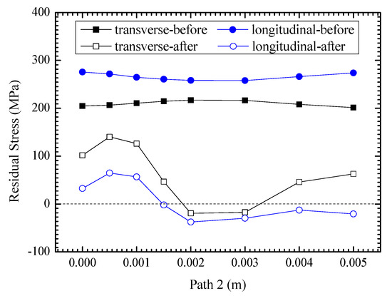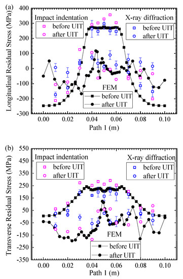 From the calculation results, it shows that the longitudinal and transverse residual stresses are larger, and the residual stress along the thickness direction is very small and ignored here. Figure 9 compares the longitudinal and transverse residual stresses along Path 1 (see Figure 1) before and after UIT by simulation and experiment. For the post-weld state, the welding residual stresses are mainly concentrated in the weld region and HAZ. In total, the farther away of location from the weld, the smaller the residual stress. After UIT, the residual stresses are significantly decreased. The residual stresses achieve the status of small tensile stresses and compressive stresses. In the weld region, it can be seen from the simulation results that there is an obvious decrease in the magnitude of the peak and average longitudinal residual stresses from 275.9 and 270.8 MPa to 66.3 and 7.6 MPa, respectively. There is an evident decrease in the peak and average of transverse residual stresses from 228.1 and 218.1 MPa to 123.4 and 24.9 MPa, respectively. In the HAZ, the peak and average of longitudinal residual stresses, with values of 273.2 and 263.3 MPa, are decreased to 117.4 and 1.2 MPa, respectively. The magnitude of peak and average transverse residual stresses decrease from 241.8 and 224.6 MPa to 12.9 and −82.2 MPa, respectively. On the impacted path, most of the longitudinal residual stresses have been in a small tensile stress state, and transverse residual stresses are basically compressive stresses after UIT. It proves that UIT could effectively reduce the welding residual stress.