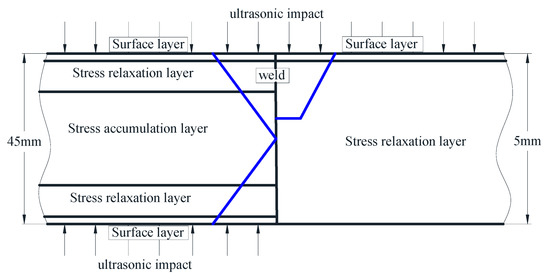 As shown in Figure 10, the internal residual stresses, including longitudinal stress and transverse stress, generally decrease greatly after UIT, which demonstrate compressive residual stress states at the middle section of sample. Due to the direct impact of the pin, the residual stress of upper surface is obviously lower than that of the subsurface. In the lower surface area, the longitudinal stress is shown as small compressive stress, and the transverse stress is shown as small tensile stress. The average decrease of longitudinal residual stress is 259.9 MPa, greater than 149.1 MPa of transverse residual stress. The longitudinal tensile residual stress is eliminated at about 1.5 mm below the upper surface, and the transverse tensile residual stress is removed within about 1.9 to 3.3 mm. The hierarchical partition is distinct according to the UIT effect in the thickness direction. Combined with the results of Liu et al. [25], the comparison of residual stress distribution after UIT in the different plate thickness is shown in Figure 11. The left is 45 mm-thick welded plate treated by UIT on the top and bottom surface, and the right is that of 5 mm treated on the top surface. According to the simulation results, the thin plate is roughly divided into two layers after UIT. The surface layer is impacted directly by the pin, which improves the weld toe morphology, reduces the surface roughness, and adjusts the residual stress distribution in the stress concentration area. Based on the previous analysis, mass plastic deformation occurs after UIT, and the residual stresses at different depths are obviously reduced. Therefore, the whole plate is in the stress relaxation layer. Liu et al. [33] had a double-sided impact on the thick plate, so there are surface layers on the upper and lower surfaces. According to the test results, the residual stresses near the surfaces are obviously decreased, and there are stress relaxation layers beneath the upper and lower surface layers. In order to balance the stresses, there is an increase in the residual stress in the middle layer of the thick plate, which is defined as the stress accumulation layer. It is the biggest difference between the thin and thick plate after UIT.
