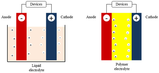 An electrolyte is a significant element in developing electrochemical devices. In general, an electrolyte functions as a medium that allows the flow of ions between a cathode and an anode. An electrolyte also functions as an electronic insulator when the devices fail to work. It is essential to have an electrolyte with a sufficiently high value of ionic conductivity, preferably much higher than 10−4 S/cm [4]. The electrolyte can be a liquid, a gel, or in a solid form. Although the liquid electrolyte still dominates in many applications, it has several limitations such as flammability issues, leaking, reaction with the electrodes, and corrosion. A polymer electrolyte (PE) offers desirable properties to overcome the problems due to the all solid state condition. It is also inherently safer, as there is no flow and corrosion after damage, it has a wider electrochemical and thermal stability range, it is light weight, and has ease of application to electrochemical devices [5]. In fact, continuous efforts are being taken on polymer electrolytes as they have a great potential to be applied in a wide range of electrochemical devices. Figure 2 shows the use of a conventional electrolyte and polymer electrolyte in a typical electrochemical cell [6].