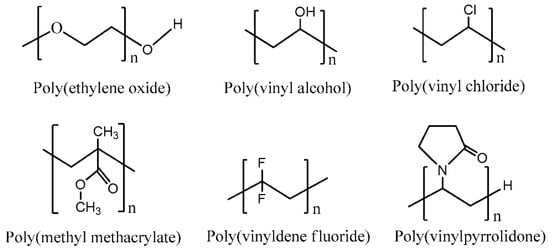 As for the construction of polymer electrolytes, several factors should be taken into consideration, including the choice of polymer host, the salts/acid dopants (the source of ions), the solvents, and other additives. The polymer host should possess certain characteristics such as good chemical, electrochemical, and photochemical stability, as well as good thermal and mechanical properties. Further, host polymers with a high concentration of polar groups (containing electron donors: O, NH, CN, F) are preferred. It is important to develop host polymers which have few crystalline phases and a relatively low glass transition temperature. In the amorphous state, greater ionic diffusivity may occur, as ions can move freely due to the low energy barrier. In addition, an amorphous polymer exhibits a flexible backbone that can increase local chain mobility. As a result, the segmental motion of a polymer can enhance the transportation property of the electrolyte [8]. Figure 3 shows the chemical structure of some polar polymers that are widely used as polymer hosts [9].
