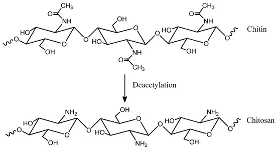 Chitosan has received considerable attention in the polymer field. It shows many interesting properties, such as being non-toxic, biodegradable, and biocompatible. Chitosan consists of 1,4 linked-2-deoxy-2-aminoglucose, which is generated from the deacetylation reaction of chitin. Chitin refers to a natural polysaccharide that can be found in various fungi and the exoskeleton of arthropods [16] such as shrimps, crabs, and lobsters. Figure 6 shows the molecular structure segment of chitin and chitin deacetylation to generate chitosan [17].