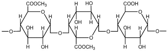 Pectin is one type of polymer that is not widely explored in the polymer electrolyte field. It is a natural polymer, present naturally in the cell walls of terrestrial plants, and is abundant in vegetables and fruits. Citrus fruits, such as oranges and limes, contain substantial amounts of pectin. At present, the major sources are citrus peels and apple pomace, which are the by-products from the extraction of citrus and apple juices [31]. Typically, pectin is used in food products as it has beneficial effects upon the health of the consumer. Commercial pectin exists as a white to light brown powder. Pectin is usually applied as a gelling agent for food production. Chemically, pectin is a complex polysaccharide that is composed mainly of D-galacturonic acid resides in α-(1-4) chain (65 wt%). Pectin is also a group of substances which forms gel when dissolved in water under suitable conditions [32]. Figure 9 shows the representative unit of pectin [33].