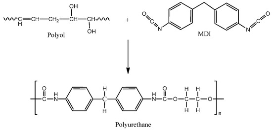 The reaction of polyol and MDI to produce polyurethane.