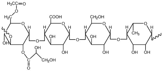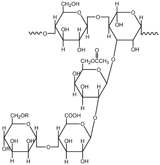 Gums are materials classified under polysaccharides with high commercial importance. They are present in many plant, animal, marine, and microbial sources [23]. Gums are available as raw powders. Table 2 lists the sources of common gums and their overall structure. The physiochemical properties of gums are determined by the chemical nature and the molecule shapes. All gums have one common similarity, which is the ability to thicken water and aqueous systems, though the rheological properties of the systems might vary depending on the types of gums being used [24]. Gums have gained many applications in various fields. For instance, in the food industry, gums are used as thickening, emulsifying, and gelling agents. In addition, they have also been applied as adhesives, binders, flocculants, and clarification aids [3]. In this section, gums that originate from marine algae and higher plants are discussed, while gums obtained from microorganisms are described in the latter part of this review.