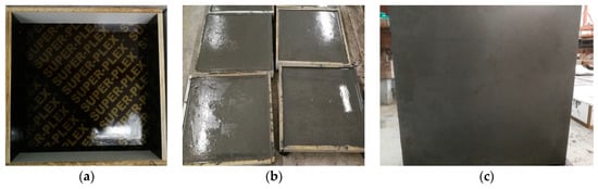 Specimens for surface appearance tests were molded in special wooden molds of size 500 mm × 500 mm × 100 mm. They were demolded after casting for 48 h and cured in the curing room for 28 days. Then, they were cut into four equal-sized pieces of size 250 mm × 250 mm × 100 mm for the following surface appearance test. The mold specimens after casting and demolding are shown in Figure 2.