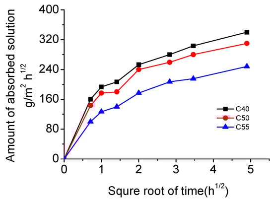 Amount of absorbed solution of C40, C50, and C55 changing with the square root of time.