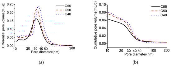 Mercury intrusion porosimetry (MIP) results of C40, C50, and C55. (a) Differential pore volume. (b) Cumulative pore volume.