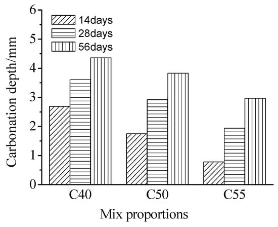 Figure 7 presents the carbonation depth of architectural concrete at different exposure times. It can be seen that carbonation depth increases with the carbonation time, which has also been found by numerous studies [29,30,31]. After carbonation for 56 days, the carbonation depth of C40, C50, and C55 are 4.36 mm, 3.83 mm, 2.97 mm, separately, which means that, on the one hand, the carbonation degree decreases with the increase of strength grade, since pore structure of C55 is denser than that of C40 and C50 (see Figure 5). On the other hand, the three mixes are all of a good carbonation resistance, inferring that the carbonation degree will be very low under the atmospheric environment. The results of the studies [25,37] showed that the carbonation resistance of concrete enhanced with the water-to-binder ratio reducing. Several studies [24,25,31,38] found that the carbonation property of concrete was closely related to the compactness of the matrix, and the denser the concrete, the stronger the carbonation resistance. It can be observed that the findings of those investigations are consistent with the findings of this study.