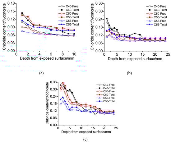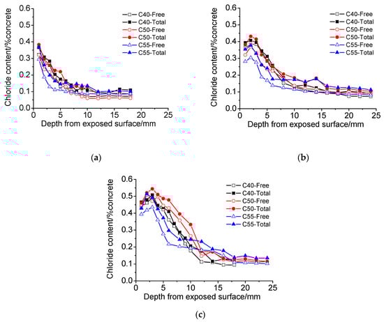 Chloride distribution of C40, C50, and C55 exposed to the tidal zone after different times. (a) 1 month. (b) 3 months. (c) 9 months.