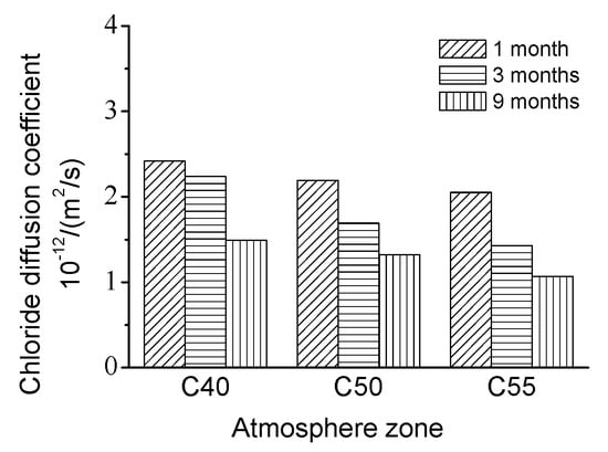 Moreover, it can also be found that chloride content increases to the decrease of strength grade. Obviously, this is closely related to the pore structures of C40, C50, and C55, as shown in Figure 5. Furthermore, Figure 9 shows the chloride diffusion coefficients (D) of these specimens after exposure for different times, which are obtained through fitting the total chloride content with the error function of the basic diffusion equation (see Equation (3)). On the one hand, D decreases with the strength grade of specimens, consisting of the change law of matrix density with C40, C50, and C55. On the other hand, all the D are quite low, which indicates that chloride penetration resistance of three kinds of architectural concretes is high and this concrete can protect steel bars from chloride attack effectively in the service duration. Besides, the D of nine months is lower than those of one month and three months. This is probably because the matrix becomes denser due to continuous hydration after nine months of exposure.