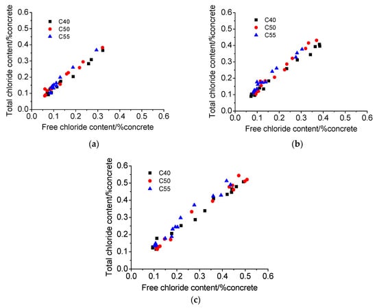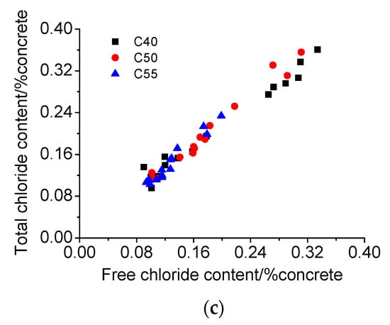 Figure 10 shows the chloride binding isotherms of C40, C50, and C55 after exposure for different times. It can be found that there is a positive correlation between total chloride and free chloride. The data distribution of the three mix proportions is relatively concentrated, but it can be observed that, generally, the data distribution of C40 is the lowest, that of C50 in the middle, and that of C55 the highest. The lower the chloride distribution is, the more the free chloride and the fewer the bound chloride. The parameters obtained through the fitting linear function (Equation (4)) are listed in Table 4. It can be seen that the correlated coefficients (R2) of all curves are large, indicating that there is a good linear correlation between total chloride and free chloride. Since both total and free chloride decrease with depth, it can be inferred the linear correlation between them also develops with depth, suggesting that the proportion of bound chloride in total chloride at different depths is basically the same. This also means that the architectural concrete of all three mix proportions can resist the heavy CO2 penetration, considering that with a large CO2 intrusion, different carbonation degrees at different depths of concrete can release bound chloride into the pore solution [46,47], resulting in the increase of proportion of free chloride to total chloride and thus a nonlinear correlation between total chloride and free chloride along with depth.