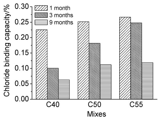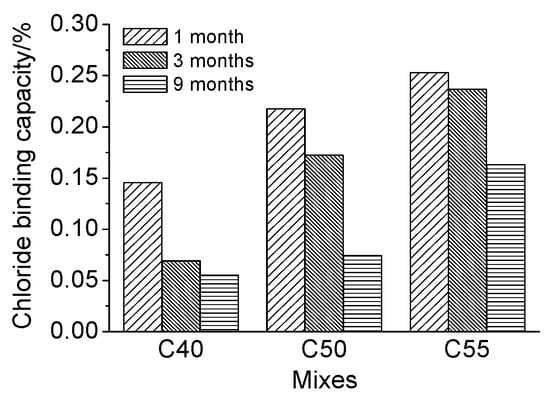 Moreover, the proportion of bound chloride in total chloride β was obtained with parameter α and Equation (5) to reflect the chloride binding capacity of concrete of different mix proportions more intuitively. The calculated results are presented in Figure 11. It can be seen that the chloride binding capacity increases with the strength grade of concrete at whatever exposure time. According to the mix proportions of architectural concrete shown in Table 2, concrete of higher strength contains more cement, FA, and SL. The increase of those cementitious-based materials boosts the content of C–S–H gel and AFm [48,49], which are two main hydration products binding chlorides physically and chemically, separately [5,46]. Therefore, the proportion of bound chloride in total chloride of C55 is the highest. The results of Florea, Plusquellec, and Shi et al. [46,47,48,49,50,51] have also presented that bound chlorides increase with the increase of C–S–H gel or AFm content. Moreover, according to the studies [3,46,48,52], C3A is deemed an important mineral composition closely related to the formation of bound chlorides in concrete, and the higher the C3A content, the more the bound chlorides. The C3A content of cement used in this study is about 9.4%, and thus, the chloride binding capacity of C40, C50, and C55 increases gradually, considering that the cement content of C40, C50, and C55 increases successively. Therefore, the enhancement of the chloride binding capacity of the matrix can better protect steel bars inside from corrosion induced by free chloride.