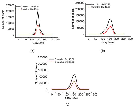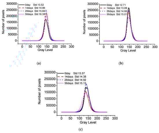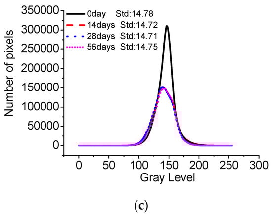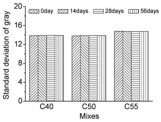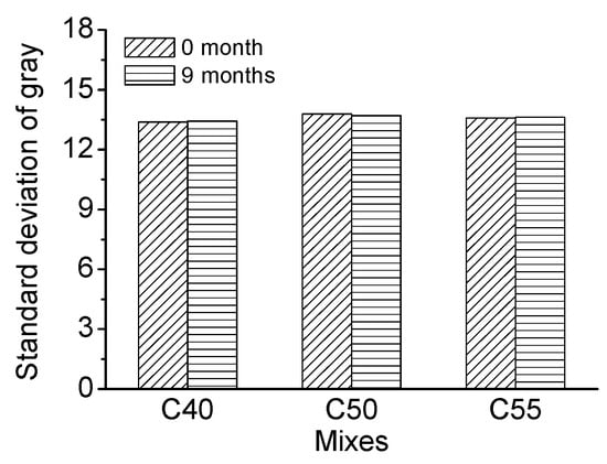 Figure 18 shows the gray curves of C40, C50, and C55 under salt fog conditions after different times, and Figure 19 presents the evolution of the standard deviation of gray with exposure time. It can be found that the standard deviation of gray only changes slightly after different exposure times, within a 0.5% range compared with the initial standard deviation of gray. It proves that salt fog will not do severe damage to the surface-color-consistency of architectural concrete.
