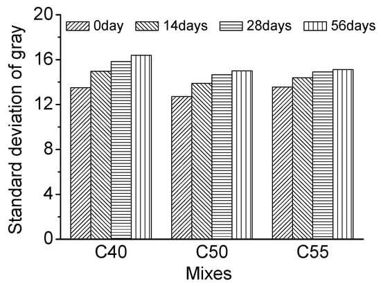 Standard deviation of gray of C40, C50, and C55 exposed to carbonation environment after different exposure times.