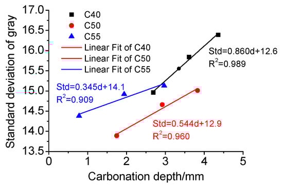 Furthermore, combining Figure 6 and Figure 16, the relationship between the standard deviation of gray and carbonation depth is presented in Figure 17. It can be found that the standard deviation of gray increases linearly with carbonation depth, indicating that enhanced carbonation is harmful to surface quality. In addition, the slope of the three mixtures decreases with strength grade increasing, suggesting that the higher the strength grade is, the harder it is for carbonation to damage the surface-color-consistency of architectural concrete, which is apparently related to the weaker carbonation effect in concretes of higher strength grade.