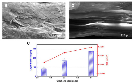 In Figure 5a, two-dimensional graphene platelets with an extremely high aspect ratio preferentially oriented parallel to each other in the prepared coating, resembling the structure of graphene buckypaper prepared using the vacuum filtration method (Figure 5b) [23]. It implies graphene coating by our proposed method can be explained by the vacuum filtration mechanism. When graphene dispersed in the resin flow was subjected to vacuum filtration, the fibrous fabric acted as the filter medium, thus leading to assemble graphene packed and horizontally aligned bulk. In addition, increased graphene resulted in a thicker coating, however, the graphene density distribution (GDD, i.e., graphene weight in per unit volume of coating) exhibited a rising trend, suggesting the graphene structure became denser as it continued to accumulate during the molding process. The possible mechanism will be investigated in the future. For now, it can be concluded that more graphene results in a denser coating, which should improve wear resistance.
