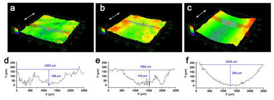 Surface features of composites: (a–c) Three-dimensional surface topography and (d–f) surface profiles of samples with raw GFRP (a,d), I-0.4g (b,e), and C-0.4 g (c,f).