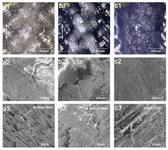 When graphene was introduced in the interlayer, some of the damage was alleviated (Figure 7b1). In addition to reducing the width of the worn area, the region of fiber breakage became smaller. Although fiber breakage did take place at the center of the worn region, most of the remaining resin was still wrapped around the fibers (Figure 7b2). Moreover, broken ends of fibers on the worn surface of the raw GFRP were flat and brittle, which would elicit a grinding effect on the surface of the interlayer embedment sample (Figure 7b3).