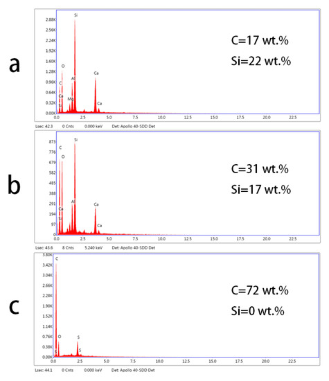 Energy-dispersive X-ray spectroscopy (EDS) characterization of the center of the worn surface can further explain the friction behavior (Figure 8). The worn surface of the interlayer embedment sample possessed a similar chemical composition compared to raw GFRP, including silicon, calcium, and aluminum elements, indicating glass fibers were present (Figure 8a,b). This also suggests that glass fiber debris was directly exposed to the counterpart. However, when the graphene coating was used on the surface, the majority of elements on the surface were indicative of carbon, suggesting the protective graphene layer served as the transfer film between the GFRP and the counterpart (Figure 8c). Therefore, even if a weak GFRP interface causes glass fibers to detach from the resin, graphene on the surface can withstand the sliding abrasion process and protect fibers from breakdown [16,26]. As a result, samples with the graphene coating only exhibited mild damage and the detachment of glass fiber was prevented.
