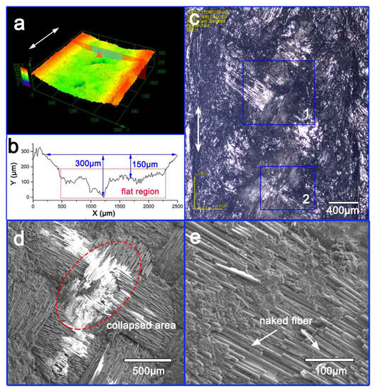 Since the lowest depth of the worn surface (300 μm) exceeded the thickness of the surface coating (Figure 9b), it can be concluded that wear damage penetrated the surface coating and inner parts of the GFRP were exposed to wear. The buckypaper coating provided a greater protective function compared to the interlayer embedment sample (Figure 9c) by reducing the breakage of fibers and resin. However, naked glass fibers still remained on the surface (Figure 9d) and broken fiber debris can be observed throughout the collapsed area (Figure 8e), suggesting that the buckypaper coating did not provide a supportive transfer film. The counterpart penetrated the coating and directly imposed shear stress on the glass fiber reinforcement, resulting in friction damage.