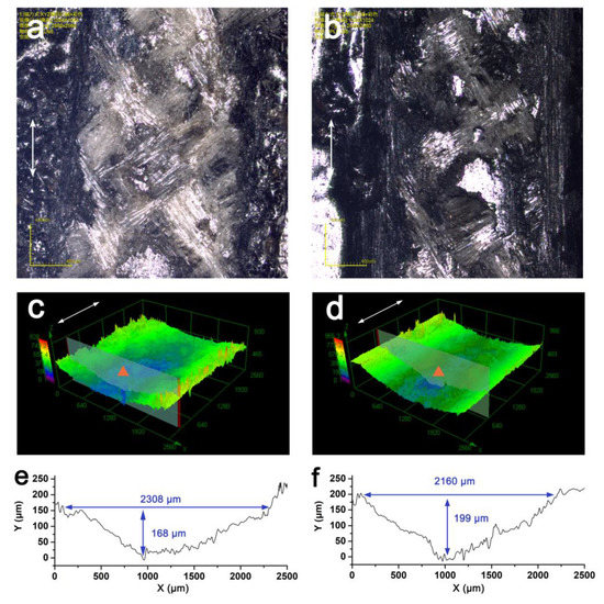 Morphology of worn surface of coating preparation: (a,b) Optical images of worn surface, (c,d) 3D surface topography, and (e,f) surface profiles with C-0.05 g (a,c,e) or C-0.2 g (b,d,f).