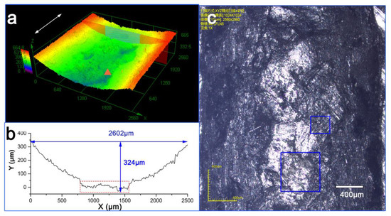 Morphology of worn surface of C-0.4 g after 60-min wear test: (a) 3D surface topography, (b) surface profile, (c) optical image of worn surface.