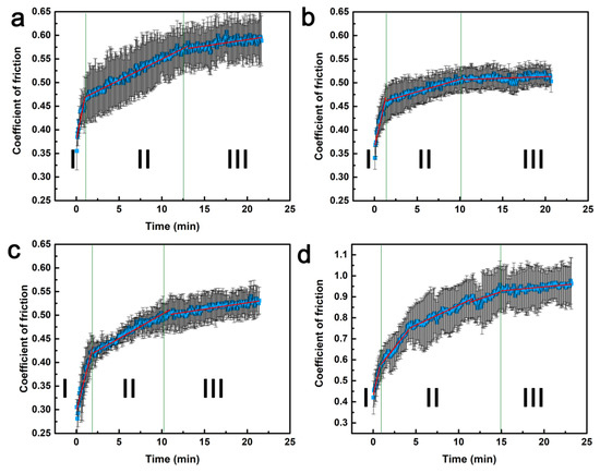 In Figure 13, evolution of COF can be divided into three stages: Initial run-in period, slow growth period, and steady-state period [25]. Each stage is divided using a segmentation fitting method, and the slope of the fitting line represents the growth rate of COF in this stage. For raw GFRP (Figure 13a), the COF started out with a relatively low value of 0.35 and rapidly increased as the production of debris began to hinder the movement of the counterpart. The run-in period transformed into the slow growth period once the transfer film formed and was compressed by the counterpart. The resin layer promoted sliding movement, decreasing the growth rate of the COF [28]. However, as more broken glass fibers are crushed by the counterpart and gradually accumulate in the transfer film, fragments of broken glass fibers can serve as abrasive particles, which hinder sliding movement. This led to abrasive wear as more material was removed by plowing and scuffing (Figure 14a). The sliding movement ejected debris out of the contact area and the sliding counterpart gradually pulverized the broken fibers, thereby reducing the obstructive effect. Finally, after a certain amount of time, the COF reached the steady state [24].