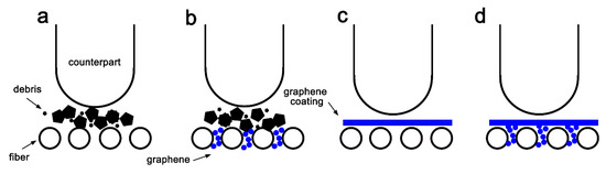 Conceptual model of wear generation: (a) Raw GFRP, (b) interlayer graphene embedment, (c) buckypaper coating, (d) graphene coating preparation.