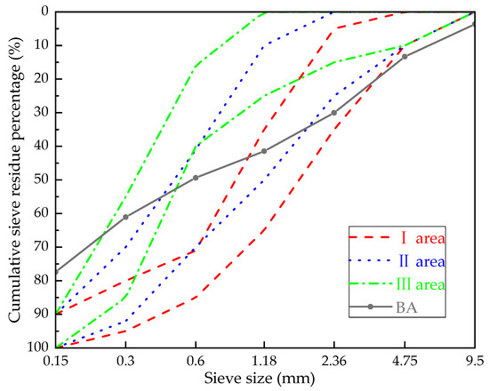 - BA: The BA used in this research was taken from a power plant in Fuxin City, Liaoning Province, China. The main chemical composition obtained by X-ray fluorescence (XRF) analysis is shown in Table 1. According to the Chinese standard “Sand for building” (GB/T14684-2011) [22], the screening curves of BA are shown in Figure 1. The bulk density of BA is 801.7 kg/m3.