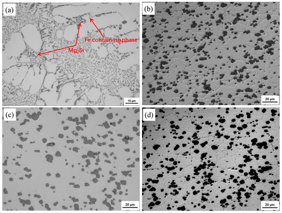 Optical micrographs under different states: (a) as-cast; (b) T1; (c) T4; (d) T6.