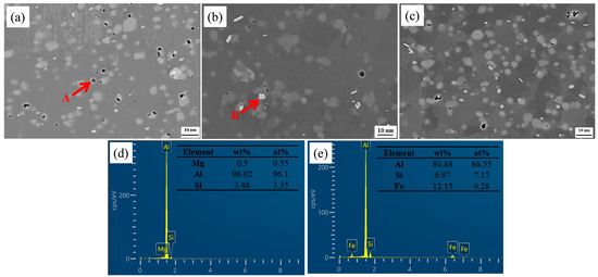 The SEM microstructures in the backscatter electron model and the chemical compositions of the main phases of BMs under different states as measured by EDS technique are presented in Figure 2. The main elements of the black particles (A) are composed of Al, Mg, and Si, indicating that these phases are Mg2Si phases. The white particles (B) are composed of Al, Fe, and Si, which indicates that these phases are β-Al5FeSi phases. As can be seen, the Mg element is mainly presented as Mg2Si particles with a size of 1.5 μm under the T1 condition. The β-Al5FeSi particles are almost unchanged in all of the BMs.