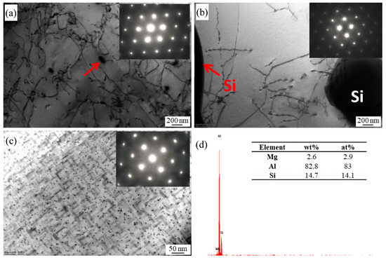 The representative TEM images of the BM with various states are shown in Figure 3. It can be seen that there are some dislocations and black fine second phases with a size of about 100 nm on the Al matrix under the T1 condition (Figure 3a). According to the EDS analysis (Figure 3d), the black fine second phases (as indicated by the arrow in Figure 3a) contained Mg and Si elements, which can be regarded as Mg2Si phases [9,21]. After solution treatment, Figure 3b shows that the Al matrix is free of any precipitate and the electron diffraction pattern demonstrated additional reflexes, which indicates that the Mg2Si phases were dissolved into the Al matrix. The microstructures are characterized by fine dot and needle precipitates homogeneously distributing on the Al matrix after solution and artificial aging (Figure 3c). For Al-Mg-Si alloys with high Si content, there are different views on the needle and fine dot precipitates. Some researchers hold the idea that the needle like precipitates are β′′ phases, and the dark dot precipitates are the end of the needle precipitates along the direction of [001] Al [22]. However, Liu et al. believed that the fine dot precipitates are not the cross section of the needle precipitates, and are β′′ [23].