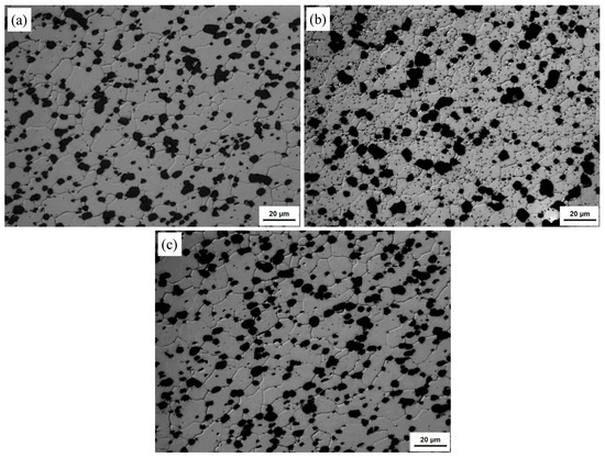 The optical microstructures at the NZs of FSW joints in T1, T4, and T6 conditions are shown in Figure 6. In all of the cases studied, the Al matrix microstructures were dominated by equiaxed grains, homogeneously distributed round Si particles. The Si particles are almost unchanged compared with those of the BMs (Figure 1). In the NZs under the T1 state, the Al matrix grain size is ~9.65 μm, which is slightly larger than that of its BM. The Al matrix grain size in the NZs under the T6 state is almost the same as that of its BM or in the NZs under the T1 state. However, the Al matrix grain size is 7.8 μm in the NZs of the T4 state, which is slightly smaller than that in the NZs under the T1 and T6 states. Figure 7 shows the EBSD maps taken from the NZs of FSW joints in the T1, T4, and T6 states. In the images, the low angle boundaries (LABs) (3°~10°) are depicted as white lines, and the high angle boundaries (HABs) (≥10°) are represented by black lines. It can be seen that the HABs dominated in the Al matrix for all of the conditions (Figure 7), and the fraction of the HABs was as high as 75–85%. Generally speaking, the microstructure in the NZs appeared to be completely recrystallized in all of the cases researched. This result was consistent with previous research on friction stir welded aluminum alloys [5,24].