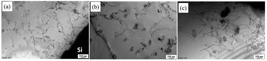 Figure 8 and Figure 9 show the SEM microstructures in the backscatter electron model and TEM images at NZs of FSW joints under T1, T4, and T6 conditions, respectively. Compared with their BM microstructure in Figure 2, the phases of β-Al5FeSi are almost unchanged in all conditions. The size of the Mg2Si phases is almost unchanged, but their density increased slightly and the small phases disappeared in the NZs under the T1 state, indicating that the small Mg2Si phases are aggregation and growth during the FSW process due to the raised temperature (Figure 2a, Figure 3a, Figure 8a, and Figure 9a). From Figure 8b and Figure 9b, it can be seen that there are many fine precipitations from the supersaturated solid solution in the FSW process and homogeneous distribution on the grain boundaries or in the Al matrix grains in the NZs under the T4 condition, which may have hindered the Al matrix grains growth. In the NZs under the T6 condition, the fine dot and needle precipitates in the BM have grown to an average size of 200 nm, or even larger second phases, which is slightly coarser than that in the NZs under the T4 condition (Figure 8c and Figure 9c).