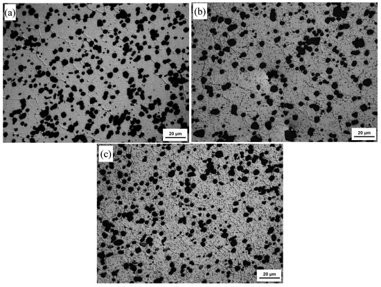 The optical micrographs of the as-cast and base materials (BM) under different states are shown in Figure 1. It can be seen that the microstructure of the DC cast alloy consists of fully developed α-Al dendrites, (α-Al + Si) eutectics and a small amount of black Mg2Si phases and gray Fe-containing phases [9,10]. The eutectic Si phases present as coral-like. It is obvious that the coral-like eutectic Si phases have been changed into fine Si particles with an average size of 3.01 μm, and the Si particles have been redistributed uniformly in the Al matrix with equiaxed grains after hot extrusion (Figure 1a,b). The distribution of the Al matrix equiaxed grains is inhomogeneous. In the concentrated silicon particle areas, the average size of the equiaxed grains is 7.47 μm. After T4 and T6 heat-treatment, it can be seen that the Si particles are more rounded and coarsened. The size of the Si particles is more uniform. The average size of the Al matrix grains and Si particles after T6 heat-treatment have been increased slightly to 7.87 μm and 3.42 μm, respectively, and the Al matrix grains are inhomogeneous under T6 heat-treatment. It should be noted that the size of the Si particles has not changed during the artificial aging treatment.