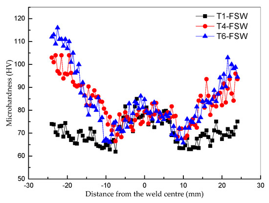 The mid-thickness microhardness profiles across the transverse cross-section of the FSW joints under various conditions are shown in Figure 12. Obviously, W-shaped hardness profiles were obtained under all conditions. The average microhardness in the NZs, whose width is about 8 mm, equivalent to the diameter of the stirring pin, has almost no variation from the base material and is higher than that in the TMAZs and HAZs under all conditions. The hardness fell through the TMAZs and reached a minimum value of 66 HV at the HAZs in the T4 and T6 states. The minimum hardness is 63 HV at the HAZ in the T1 condition, which is slightly lower than that in the HAZs under the T4 and T6 conditions. The hardness values in the weld joints are significantly lower than those of the BMs under the T4 and T6 states. The FSW process softened the T4 and T6 materials, with the microhardness in the NZs decreasing by nearly 20% and 27% to about 80 HV. However, the hardness values in the NZs are almost equal to or even higher than that of the BM under the T1 state.