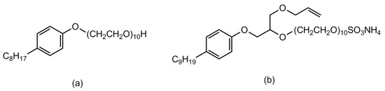 - Sun, Y.; Qiao, W.; Liu, H. Synthesis of a novel series of polymerizable surfactants and application in emulsion polymerization. Polym. Adv. Technol. 2008, 19, 1164–1167. [Google Scholar] [CrossRef]