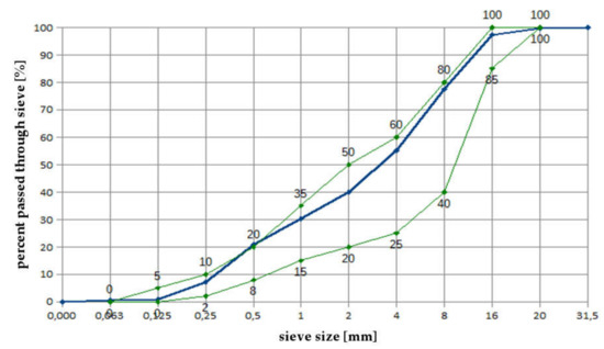 As aggregates, typical pebble gravel 2/8 and 8/16 coarse aggregate from central Poland, rinsed with mining sand, were used. Figure 3 shows a sieving curve of the prepared mixture of aggregates. Border curves are taken from the PN-B-06265 standard [26].