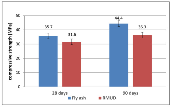 The class of concretes was calculated according to EN 206 for starting production. FA concrete reached one class higher than RMUD concrete after 28 and 90 days of curing. The differences between compressive strength at days 28 and 90 show the potential of pozzolanic activity of both additives because concretes, which were made using only CEM I as a binder (without additives), do not show such an increase, according to Gołaszewski et al. [39].