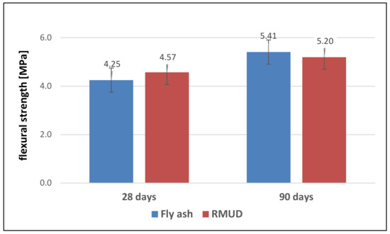 Figure 6 presents the results of flexural strength tests of FA concrete and RMUD concrete after 28 and 90 days. The values of flexural strength for both concretes were very similar