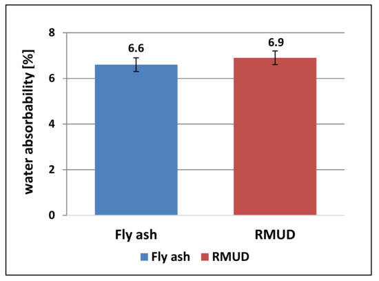 Figure 7 presents the results of the water absorbability test. Both concretes had almost the same absorbability—above 6%. This is quite a high value for concrete, but those concretes were not optimised for low absorbability, and the tests were carried out to spot differences between RMUD and FA concretes.