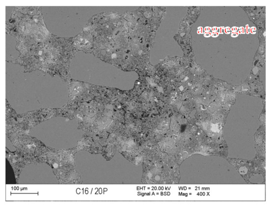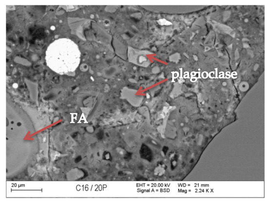 Back-scattered electrons (BSE) image of concrete with fly ash (FA).