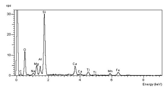 FA samples were visibly less porous than RMUD ones. RMUD samples contained unreacted particles of waste such as: ruthyl, pyroxenes, plagioclases and slightly reacted silicon dioxide. Also, partly leached ilmenite grains with a CSH phase with a partly modified composition were observed between ilmenite layers. RMUD concretes contained an almost unreacted silicone dioxide glass phase with additions of other constituents, such as magnesium, aluminium, sodium calcium and traces of titanium iron and manganium (Figure 16).