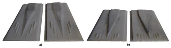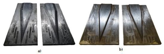 The tools for physical modelling of the limits to the cross-wedge rolling of the model material: (a) inner cracks (Test 1); (b) slippages, neckings and ruptures (Test 2).