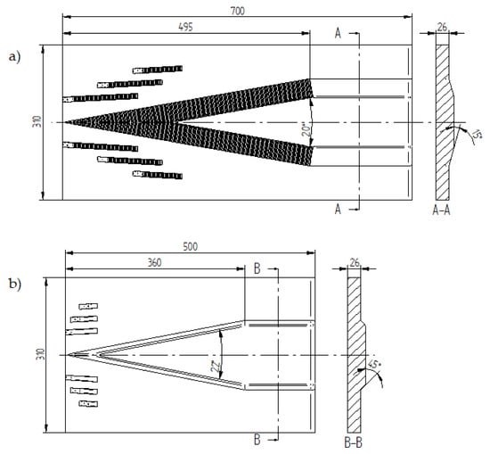 The tools for testing the hindering of the inner cracks of the products (Test 1) are 310 × 700 mm. The forming angle α equals 15°, and the β wedge flare angle β = 10°. Such choice of angles ought to initiate the occurrence of cracks along the axis of the formed element. The tools for investigating slippages, neckings and ruptures of the samples (Test 2) are characterised by the forming angle α = 45° and the wedge flare angle 11°